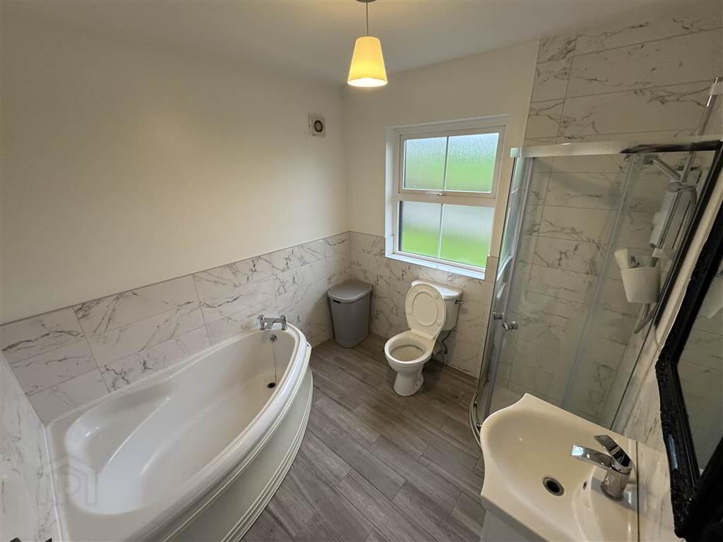 Tiled wooden flooring, corner bath with seperate shower. Window to rear of property.